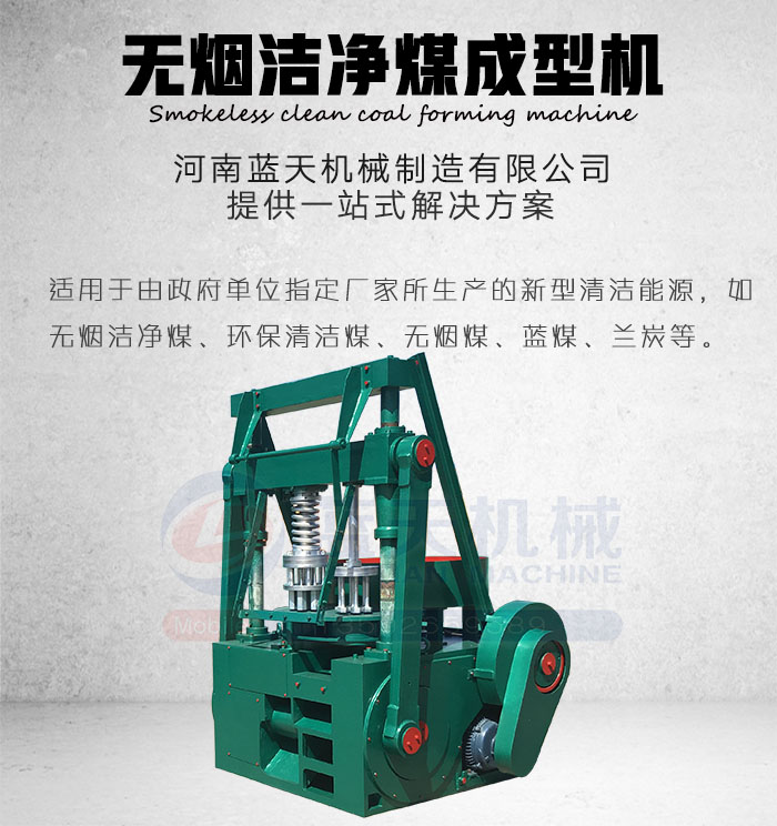 河南藍(lán)天機(jī)械制造有限公司生產(chǎn)無煙潔凈煤成型機(jī)目的在于面對當(dāng)今中國環(huán)境污染,霧霾困擾等問題促進(jìn)無煙潔凈煤民用使用率。