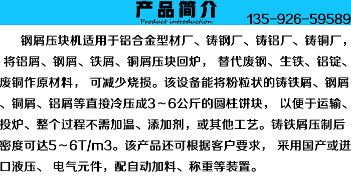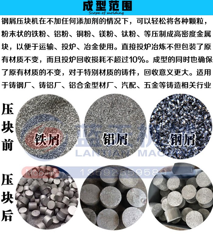 藍天機械鋼屑壓塊機可以將各種鋼屑在不不加入任何粘合劑的情況下壓制成高密度圓柱形餅塊,根據(jù)原料的不同,壓制出餅塊的密度與重量也不相同,適用于鑄鋼廠、鑄鋁廠、鋁合金型材廠、汽配、五金等鑄造相關(guān)行業(yè)。