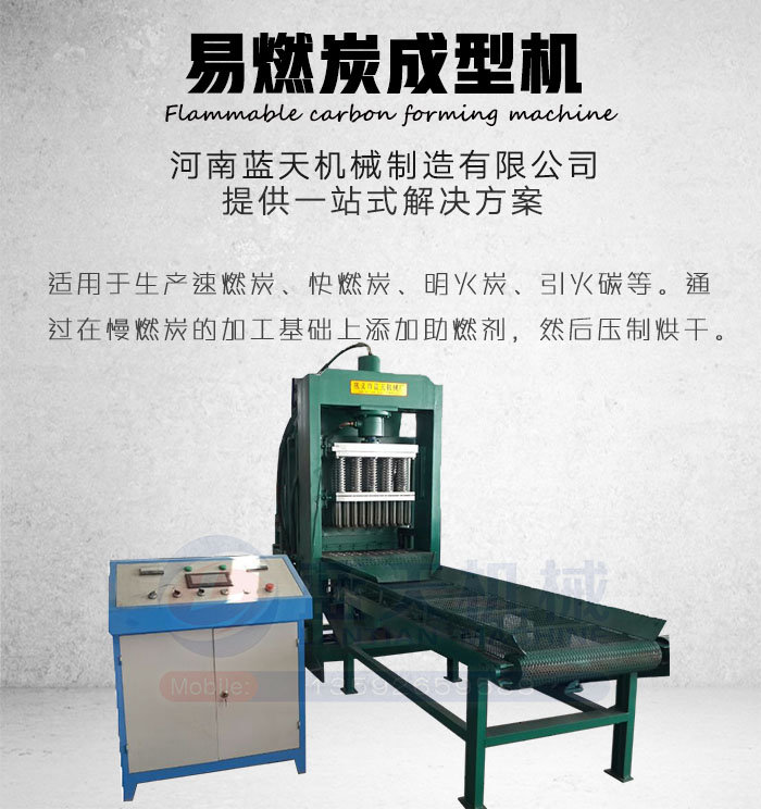 易燃碳成型機(jī)是由河南藍(lán)天機(jī)械制造有限公司運(yùn)用轉(zhuǎn)化技術(shù),將生物質(zhì)材料經(jīng)炭化粉碎后成型的成型設(shè)備。易燃炭是為方便野外燒烤使用而生產(chǎn)的一種速燃炭、引火碳、快速點(diǎn)火碳等,主要用于戶外燒烤快速引燃。易燃碳成型機(jī)可以方便的調(diào)換摸具,以便生產(chǎn)各種形狀尺寸的易燃炭,目前市場(chǎng)上常見(jiàn)的易燃炭分為圓柱形和蜂窩煤形。通過(guò)調(diào)換模具能生產(chǎn)出生產(chǎn)圓形、方形、梅花形、扇形、中心有孔無(wú)孔等特殊形狀。河南藍(lán)天機(jī)械制造有限公司一站式提供各種技術(shù)配方,為用戶規(guī)劃場(chǎng)地、現(xiàn)場(chǎng)指導(dǎo)、安裝調(diào)試。