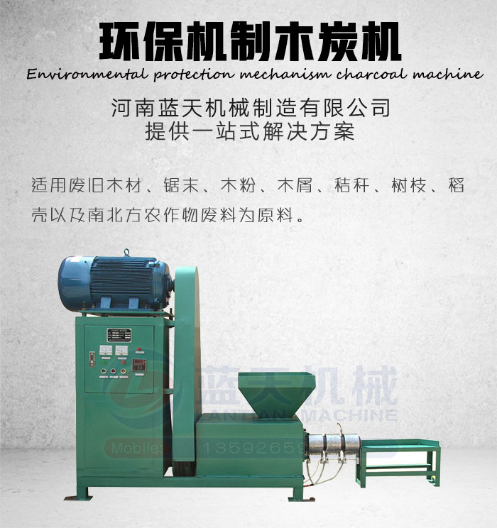 環(huán)保機(jī)制木炭機(jī)是以廢舊木材、鋸末、木粉、木屑、秸稈、樹枝、稻殼以及南北方農(nóng)作物廢料為原料,粉碎后經(jīng)環(huán)保機(jī)制木炭機(jī)高溫、高壓塑化后成型為機(jī)制木炭半成品,后經(jīng)炭化即為環(huán)保木炭。河南藍(lán)天機(jī)械制造有限公司是專業(yè)生產(chǎn)環(huán)保機(jī)制木炭機(jī)設(shè)備的廠家,咨詢環(huán)保機(jī)制木炭機(jī)價(jià)格請(qǐng)撥打官網(wǎng)熱線了解更多!